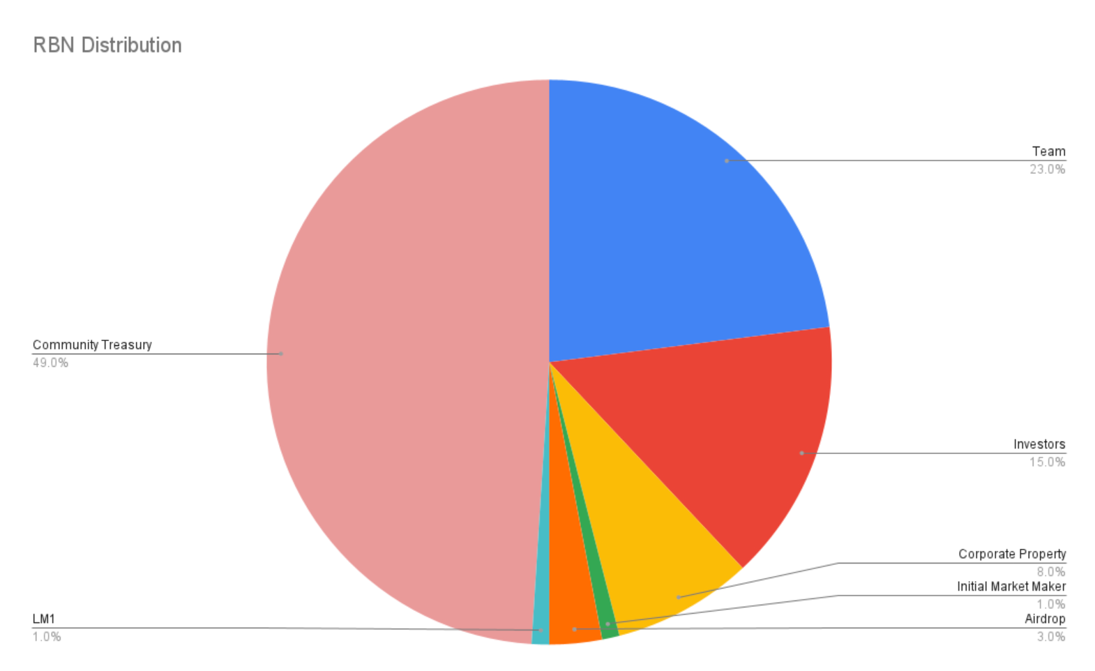 **- 49% to Community Treasury** This community treasury is controlled by RBN Governance, and can be used to incentivize liquidity mining programs, provide provide grants to developers, and other programs to improve the protocol. 20% of this supply is unlocked immediately, and the remaining was vested linearly over 3 years starting from 24th May 2021.